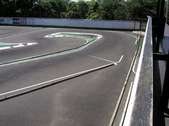 | 最終コーナーからピットへの入口。BOSS SPEEDの特長として、コントロールタワー前はストレートではなく、ヘの字になっている(ようだ)。最終コーナーをクリアすると、即、ピットへの入口。ピットレーンはKawasemi.Jrなどのようにピットエリアと平行になっているのではなく、三角形の広場になっている(らしい)。したがって何台も一緒にピットに入ってきた場合には、ドライバーは他の車を避けるために、写真で言えば、大きく左に膨らんで自分のピットクルーが待機している場所に車をつけるという感じだろうか? |