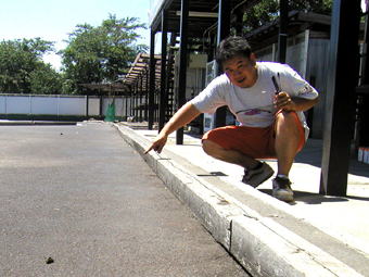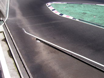 | ここがピットエリア。大きな角材でピットレーンとピットエリアが仕切られており、ピット側には角材とほぼ同じ高さで幅40cmくらいの段がつけられている。問題はこの角材の高さ。おそらくハチイチのリヤと同じ高さくらいと思われるが、ピットに入ってきた車を掴むためには、かなり前屈みにならないと取れないかもしれない。角材よりも遠くに車を止めると取りにくいし、逆に角材に近すぎても、今度はいったん真上に車を上げて、自分の方に引き寄せるという動きをしなければならず、大きくタイムロスしてしまう・・・。 |