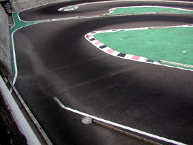 写真左上は、ピット出口から1コーナー付近の写真。ピットを出る際に、即、コースインしてしまうと、最終コーナーを立ち上がってきた車のラインをふさいでしまい、事故を引き起こす危険性が高い。ピットを出る際には細心の注意を払って出る必要がある。写真右上は、1コーナー付近の写真。走行ラインは黒くオイルが乗っているところを参考にしてもらいたい。