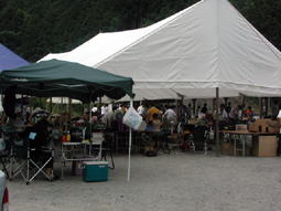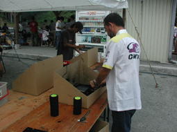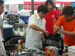 最終日は、朝から厚い雲に覆われ、天気予報では午後から雨になるらしい。そんな中、ファイナル進出めざし、各ヒートとも熱く激しいバトルが展開されている。写真右から2番目は、我らが棟梁。言葉少ないけど、私たちを強力にサポートしてくれるとともにみんなの心の支えでもある。写真ではトシゾー店長が使用するタイヤを削っているところ。写真右は、最終日、私が応援する選手の一人、四国のクラッシャーさん。写真は、1/16ファイナル(でしたっけ?)を勝ち上がり、1/8ファイナルスタート前のパドックの様子。