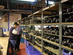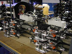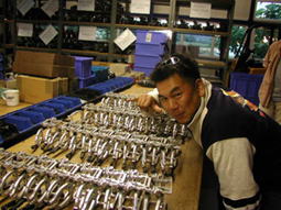 空港を出発して3時間。ようやくFG社に到着。現地時刻で20時20分頃。しかしまだ明るい。事前にFG社宛に送ったお互いの車を受け取り、レンタカーに積み込む。積み込みも終わり、せっかくFG社まで来たんだからと、ちょっとの間、会社見学をすることに。まずもって広い広い。その中に整然と管理されたキット&パーツ群。真っ先に私たちの目にとまったのは、びっしりと並んだコンペのフロント周り。全部で100台近くはあっただろうか?でもその中から日本に入ってくるのは、ほんの数台。半完成済みのコンペシャシーやエコラインが棚いっぱいに並んでいる様は、まさに圧巻。おまけにエンジンはエンジンでぐっしりと並んでおり、世界のFG!を実感できた。