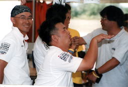山崎さんの指示で、明日から始まる決勝レースに向け、ミーティングを始める。決勝の組み合わせが発表となり、ハシモトくんとKEIさんが同じ組。そして私と山崎さんが同じ組。ハチさんのところまで勝ち上がるためには、2回、最終日まで残るためには、実に6回勝ち上がらなければならなかった。決勝の組み合わせ、出走時間、使用するバンドの確認を行なう。写真は、壊れてしまったトシゾー店長!?