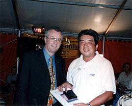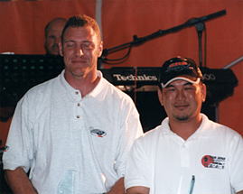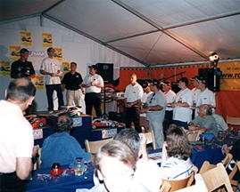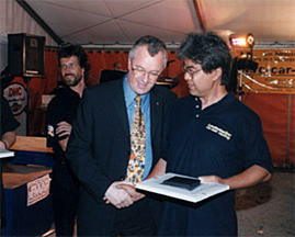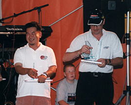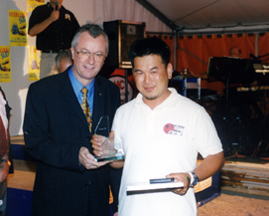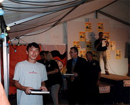 | 世界戦ファイナル10位の証として、トロフィーとメダル、そして写真集を手渡されるトシゾー店長。写真は小さくて表情までよく見えないだろうけど、とってもいい顔していた。ファイナリストが全員ステージの前に並んでいく。そしてトップ3は、ステージ上に設けられたお立ち台の上に、車と一緒に昇るのだ。最後に呼ばれた初代チャンピオンStrauch。表彰式も最高潮を迎えたのであった・・・。 |
