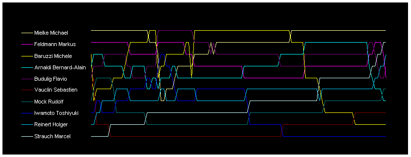 一番最初は、1ラップ目からスタートしている。トシゾー店長は10番グリッドだったが、1周目は8位で通過。スタートして21ラップまでは、TQのMielkeがトップを走るも、22ラップでは、一時は7番手まで後退したBaruzziがトップに立つ。しかしすぐさまFlavioがトップを奪い、37ラップまでレースを引っ張る。38ラップ目からは、再びBaruzziがトップに立ち、中盤、レースを引っ張るカタチに。序盤、激しく順位変動があったレースも中盤から終盤にかけて大きな順位変動はなかった。