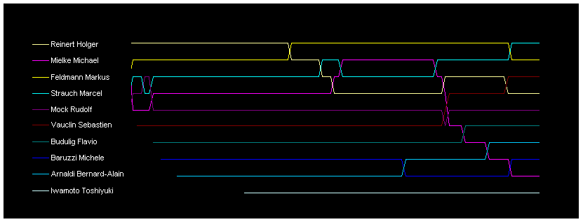 記念すべき第1回の世界選手権で優勝まであと8分!というときにまさかのリタイヤ。今年のヨーロッパ選手権などでは、その実力をいかんなく発揮し、今大会ではコラーリと並び、優勝候補の筆頭にあげられていたMielkeだっただけに、その落胆ぶりは・・・。コントロールタワーから降り、悔しさをこらえきれずに、一人、木陰で泣いていたMielke・・・。