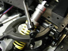そこで一度、バルクから左右のアッパーアームを取り外し、説明書と一緒に万力に挟んで、慎重にドリルで穴を開けた。あとはスタビバーをダンパーステーに固定する。この時、スタビバーの動きがシブいと、せっかくシャカシャカ動いていた足も意味をなさない。かといって、バーに遊びが多すぎても、スタビの効果が半減してしまう。適度に調整する必要があるのだった・・・。