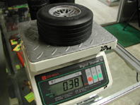 組み上がったタイヤを手にしてみる。ツーリングのタイヤよりもでかいから、当然重たく感じる。いったいどれ位重いのか、さっそく計量してみた。フロントタイヤは0.38kg、リヤタイヤは、0.52kgもあり、4本だと1.80kgにもなる。