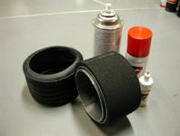 さて、タイヤの接着方法は、以前、FGメモで掲載したけど、インナーを瞬間接着剤を使って張りあわせ、ホイールにかぶせる。続いてタイヤのイン側を手でめくるように内側から外側へ押し広げる。ホイールにタイヤを組み込む際には、あらかじめホイールにかぶせたインナーにメンテナンススプレーを十分吹きかけ、乾く前に、タイヤを押し込む!のだけど、F1のタイヤは、ツーリングに比べ、径が大きく、組み込むのに一苦労。やっと入ったと思ったら、インナーがめくれているところがあり、再びタイヤを取り外す始末。どうにかこうにか4本組み上げ、あとは瞬間接着剤とプライマーを使って、ホイールにタイヤを接着する。この時も、うまく接着剤を使わないと、いたるところ真っ白けになってしまい、せっかくのかっこいいタイヤが見るも無惨な姿になってしまう。何回やっても苦手なタイヤの接着。上手に組むためには、やはり経験が必要なのだろう・・・。