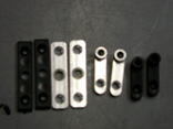 フロントブレーキF1用には、取り付けるために必要なパーツが全てセットになっているけれど、ここで早くも「ガイドプレート(ボールベアリング取り付け用)」、「メタルブッシュ」、「アルミケーブルホルダーF1/1:6用」、そして「チューニングブレーキディスク」に交換。写真左はガイドプレートと、ケーブルホルダーの比較。樹脂パーツからアルミパーツに交換。理由としては、やはりブレーキング時のへたりを解消したいから。そしてガイドプレートにはベアリングが使用されており、ブレーキを離したときの戻りをよくしたいのが理由。 |
