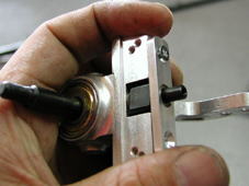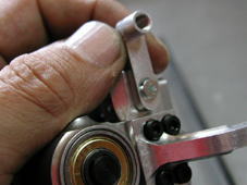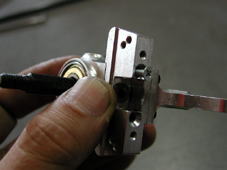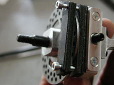 写真右はブレーキディスクとパッドを取り付けるところ。セット付属のブレーキディスクの重さは2枚で60g。それに対しチューニングブレーキディスクは2枚で40gと、だんぜんこっちの方が軽い。ここもセットに付属している2本のビスで固定するが、この時、上下、そして右側と左側との締め具合を同じにしないと左右でブレーキの利きが違ってしまう。わずかな締め具合の差でも利きが違うそうだから、ここは慎重にしたいところ。でも実際に走らせてみないと分からないので、おそらくこれくらいだろうという程度にしておいた。 |