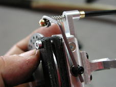 | 写真左は、ケーブルホルダーの取り付け。ブレーキパットの反対側に取り付ける。写真右はブレーキロッドとケーブルの取り付け。ロッドが左に傾いているのが分かるだろうか?これが右に傾いていれば、右用となる。実は右と左を間違って組んでしまった私であった・・・。ロッド側にはワッシャーを入れて、スプリングも入れる。ホルダーにはケーブルホースの金属部分をねじ込んで固定する。 |
