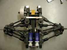 シャシーから降ろしたリヤ周り。フロント同様、ボールエンドにネジを締め込む。でも左右のアクスルキャリヤーからボールエンドを外したら、取り付けるのに一苦労。というのもスチールボールがアクスルキャリアーぎりぎりなので、ちょっとでも曲がっていたら全く入らない。写真右は、カウンターシャフトに取り付けられたキット標準のリヤブレーキ。オプションでリヤアップライトに取り付けるブレーキもあるが、まずはこのブレーキでシェイクダウンする。左右のブレーキシャフトにロッドが付いており、これを一緒にサーボで引いて、ブレーキをかけるようになっている。ブレーキをかけた時の効き具合は、実際に走らせてみないとわからないので、ここでは何もさわらなかった。