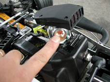プロポと車の電源を入れ、正常な位置にエンコンのリンケージが戻ると、エンジンがストップしてしまった。アイドリングが低いので、マイナスドライバーを使って締め込んでやる。ハイ側とロー側のニードルはキット状態のままなので、かなり甘め。コースイン前にブレーキのチェック。リヤはプロポ側で調整するが、フロントは、どうしても左右の効きが違うので、ホイールの外側から、ブレーキパットを固定しているビスに六角レンチを差し込んで調節する。とうちゃんや棟梁、たっちゃん、そしてトシゾー店長が見守る中、いよいよコースイン。