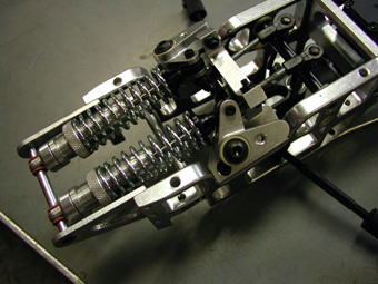 一番上はHARM FX-1のダンパー。分解していないが、サークリップを使用して、しっかりとOリングが固定されている。次はFGのダンパーで、3番目はラウターバッハのダンパーである。ラウターバッハ&HARMともに、ツーリングのコンペティションモデルは、いずれもインボードタイプのダンパーを使用していたこともあり、ダンパーの精度は高いと思われる。もちろんFGのダンパーがダメという訳ではなく、Oリングの点検をコマメにすることで、オイル漏れを防ぐことができるし、容量の大きいダンパーであるから、10kgを越える1:5モデルの動きをしっかり路面に伝えることができるのも特長だ!