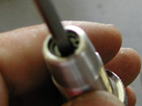 サーボの搭載が終わり、続いてフロントダンパーの取り付けにかかる。ダンパーからバネなどを外し、ダンパーエンドを持って、ゆっくり上下させてみると、かなりエアをかんでいる。そこで一度、ダンパーオイルを抜き取り、新しくオイルを注入することにした。