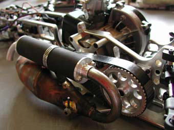 HARM FX-1を目にした時、これまで紹介したメインシャシーや前後のアルミバルクヘッド、サスペンションレバー(VETEQやNTで言うロッカーアーム)などの前に、強烈に焼き付いたのは、もはや芸術品とも言えるファーストワンのパイプ!