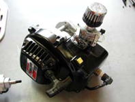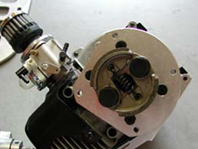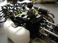 HARM FX-1のエンジンは、ゼノア230RCが搭載されている。クラッチは写真右上のとおり、FGエコラインなどでおなじみの2ピース・クラッチがついている。関西のYNさんの話によれば、「いろいろとクラッチを使ったけど、ノーマルのクラッチが一番いいんじゃないかなぁ〜」とのこと。ただクラッチのバネはノーマルタイプと思われ、これを強化タイプに変われば、ミートもシャキっとなるだろうし、アジャスタブルのクラッチへの換装も無加工でできるかもしれない。