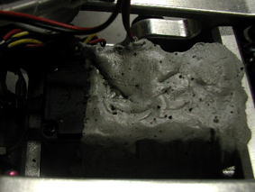 続いてステアリングサーボの防水。私はHITECを搭載しているのだが、ヒートシンク部分から水が進入するのは明らかなので、テープでヒートシンク部分を塞ぎ、その上からクリーニングパテ=粘土を盛った。