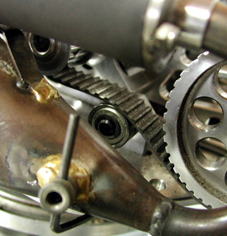 FX-1は、エンジンを前後にスライドさせてサイドベルトのテンションを調整できない。そこでキット標準の18Tよりも小さなプーリーを取りつけた際に、ベルトがゆるゆるになるため、テンシュナーが必要となる。