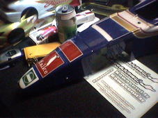 | もったいぶって2枚しか、それも一部が写った画像だけ。でもこれを見ても、そのすばらしい出来映えが伺えると思う。ロゴなどは全て手書き!ボディを預けて1カ月半、龍の塗り師さんは、何度も何度も下書きを消し、消しては書いていたとJINくん。とんでもないことを依頼したと思いながらも、感謝の気持ちでいっぱい。塗り師さんの魂が宿ったFW19が、Super Indy Sircuitを走る日は、すぐそこまで来ているのだ!! |