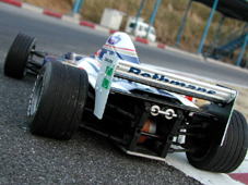 いよいよFW19のボディを搭載してのドライブ。「それってさぁ、もったいないよ。だって芸術品だよ、そのボディ。走らせるの、もったいないじゃん!」ってみんなから言われたけど、だってこれはディスプレイモデルじゃなくって、RCだよ?ただ見ているだけじゃなくって、自分の意のままに走らせるんだよ!って思いながらも、絶対にクラッシュなど許されない状況での走行は、とっても緊張した。タイヤウオーマーで入念に温めたのちコースイン。ギャラリーが3000人くらいはいただろうか?そんな訳ないけど、10人ほどのギャラリーが見守る中、グリップの状況を確かめながらの走行に入る。