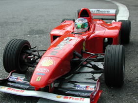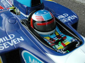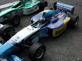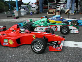 さてベネトン、ジャガーのシェイクダウンを前に、Dr.Aのフェラーリ(佐藤ボデー作)が着々とテストを重ねている。とっても印象的だったのは「楽しい〜!かっこいい〜!」を連呼しながら、コントロールタワーに上がったまま降りてこないDr.A。電欠するのでは!?という私たちの心配をよそに、思う存分ビッグスケールF1を楽しむその姿を見て、1:5F1クラスでは、レースの勝ち負けは抜きにして、心底RCカーを走らせる楽しみを満喫できる雰囲気やイベントを、みんなで育てて行けたらいいなぁと心からそう思うのでした・・・。