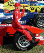 そんな中、新たなアイテムも登場した。レポートのトップページにも紹介したが、それは「龍の塗り師」改め「龍の縫い師(?)」親方手作りのレーシング・スーツ&キャップを身につけたミハエル・G・I・ジョー!もともとはBugsy-Kさんのコレクションだった「リカちゃんFerarri人形」のレーシング・スーツを、G・I・ジョーに着せてほしいと親方に依頼した聞いたが、出来上がってきたそのスーツは、手作りだというからこれまたびっくり。昔からお父さんのネクタイやシャツを使って人形の服を作ったりすることが趣味だったという「龍の塗り師」さんは、子どもの服も自分で縫っているそうだ…。ミハエル・ジョーをとうちゃんのFerarriに乗せて、「いやぁ〜よく出来てるねぇ〜」「最高じゃぁ〜」「…(ただ笑顔)」「今度は22体作ってさあ、ジオラマしようよ!」とか何とか、みんなでわいわい言っていた私たちは、OPEN、STOCKに参戦するみんなの目には、いったいどう写っていたのだろう…。 |