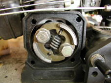 もうひとつ、気になっていたこと。「クラッチのスプリングは柔らかいんじゃないか?」。FGエコストックでは、純正のクラッチスプリングからハードタイプのスプリングに変更するので、試しにゼノア用のハードスプリングに交換してみた。スプリングの交換は、ピニオンギヤ&スパーギヤーを外し、クラッチベルを固定している4本のビスを外すと、左上の状態となる。プラグを外し、別売りのピストンロックをねじ込んで、ボルトを外すとクラッチの部分が外れる。バネを取り付け、コースイン。solo