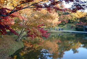 | もみじで有名なこの公園なんですが、湖面に映る景色の方が、目に飛び込んできちゃいます。 |