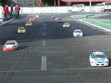 コンペティションクラスのBメインレースが終了し、いよいよコンペクラスAメイン決勝が始まる。ホームストレート上のグリッドに各車並べられる。写真の一番右下がtamaさん、左下が私。ボンバー山本から選手紹介があり、ドライバーはエンジンをかけコントロールタワーへと登っていく。タイヤを暖めるため、5周ほど周回し、フラッグを受けたのち、全車グリッドについた時点で、決勝レースがスタートする。しかし途中で全車、ピットに入れられてしまう。どうやら大森くんの車が電波トラブルらしく、クリスタルを交換している。エンジンを止めて、再度グリッドからのウオーミングアップ走行。