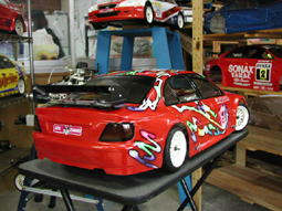 ◆NEWボディ完成・・・世界戦用として購入したFGのライトウエイトボディ。従来のボディと比較して未塗装時で140g軽い!カラーリングは、もちろんトシゾー店長の手によるもの。超多忙な毎日が続くなか、前夜遅くまでかかって塗装してくれたのだ。前衛芸術?あるいはアバンギャルド?ともいえるコテコテなNEWボディ。リアウイングはもちろんカーボン製!