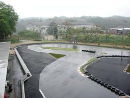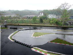 続く正面のコーナーはあまりグリップしていなかったように思う。もしかして登り坂になってるためか、車が転がってくれない。だから突っ込みすぎると、どアンダーとなり大きく失速するので、できるだけ小さく回れるように、ここでも微妙なアクセルワークを心がけ、出口を向いたところで、徐々にアクセルを入れていく。次のコーナーも難しかった。手前のトンガリのどの位置にクリッピングを持っていくかで、最終コーナーへの進入角度、そしてスピードが全く変わってくる。かなり奥側にクリッピングをとり、最終コーナーへ。最終コーナーではクリッピングを手前にとり、小さくターンするように心がけ、あとはコントロールラインに向かって走るだけ。「行け、行け、行けぇぃ!!」