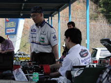 かと思えば・・・・メンテナンス台にF1を乗せ、なにやらゴソゴソやっている男が・・・。誰かと思えば、私のパソコンの先生、あだたくちゃん!黒いサングラスに、もちろんチーム・ロスマンズのシャツ!その無口に黙々と作業をこなす姿は、パソコンをさわっている時のようにかっこいい!(惚れてしまいそうだ!あっ!)。もちろんシャツは、ジーンズに入れている!話を聞くと、なんでも1年契約の専属メカニックだそうだ??そう熱くチームオーナー兼、ドライバーの同じユニホームを着たKS氏が目を輝かせ長々と語ってくれたのだった。^^;。ん〜〜〜なにか狂ってるぅ〜〜〜!と、一瞬思ったが・・・私には充分共感でき、熱い何かを感じた!