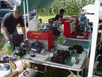 朝からずっこけムードの中、車は約4時間ほど走り、車中では会話もはずみ、ツアー開催地では最南端、鹿児島ロフト・サーキットさんに到着!私の第一印象はと言うと・・・とにかく暑い!あつすぎる!とけそう!サーキットの方はと言うと、チーム龍のJIN君から以前もらった情報通りで、やはりギヤップ(特に1コーナーあたり)が気になるのと、コースを仕切る鉄のフラットバーがやばそうな気がする。。早速みんなで手際よくサーキットから1段下のエリアにテントを張り、パドックを設営。テントは3張り、2張りは3チームとクラスA出場の浜小君、もう1張りは、いつもカワセミさんのご好意で持って来てもらってる人数分の大量のタイヤとVoneR&IMPLUSEのスペアーパーツ用テント・・。特にIMPLUSEパーツは重宝されたみたいです。サーパントユーザーの方、現地でパーツに困った時は声をかけてみて下さい(ってもう終わってるぅ〜)。もちろん私たちも、タダではありませんが!!