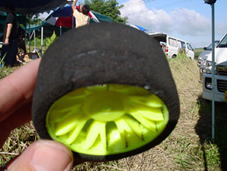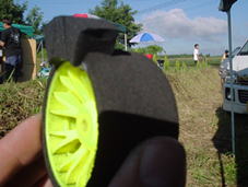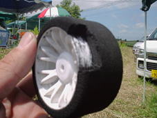 だが、最近のRCはけっこうお金がかかる・・と言うか、かけたくなるもんだ!マシンの値段やパーツの値段を妻に言う事は出来るが(たぶん?)、さすがに、ウン万円のタイヤセッターでウン千円のタイヤを削り、しかも30分も走ればゴミになるとは、さすがに言いきらん・・・(爆)。とは言うものの、それがレースであって、面白い所じゃないかと思う。しかし、新品のタイヤを思いきってカットしたのに1〜2周で欠けてしまっては、さすがに凹んでしまう(;;)