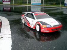 雨の中でレースは進んで行く。パドックでは、みんな忙しそうに防水加工やエアーフィルターの加工をしている。予選の前に練習走行がヒート別に行われ、私の練習走行の番が来る。エンジンも素直にかかり、順調に周回を重ねる…ん〜〜(^^)。確かに手軽だ!グローエンジンみたいにアイドリングも止まらない、、がぁ〜!突然エンジンが吹かなくなり…動かなくなってしまった!